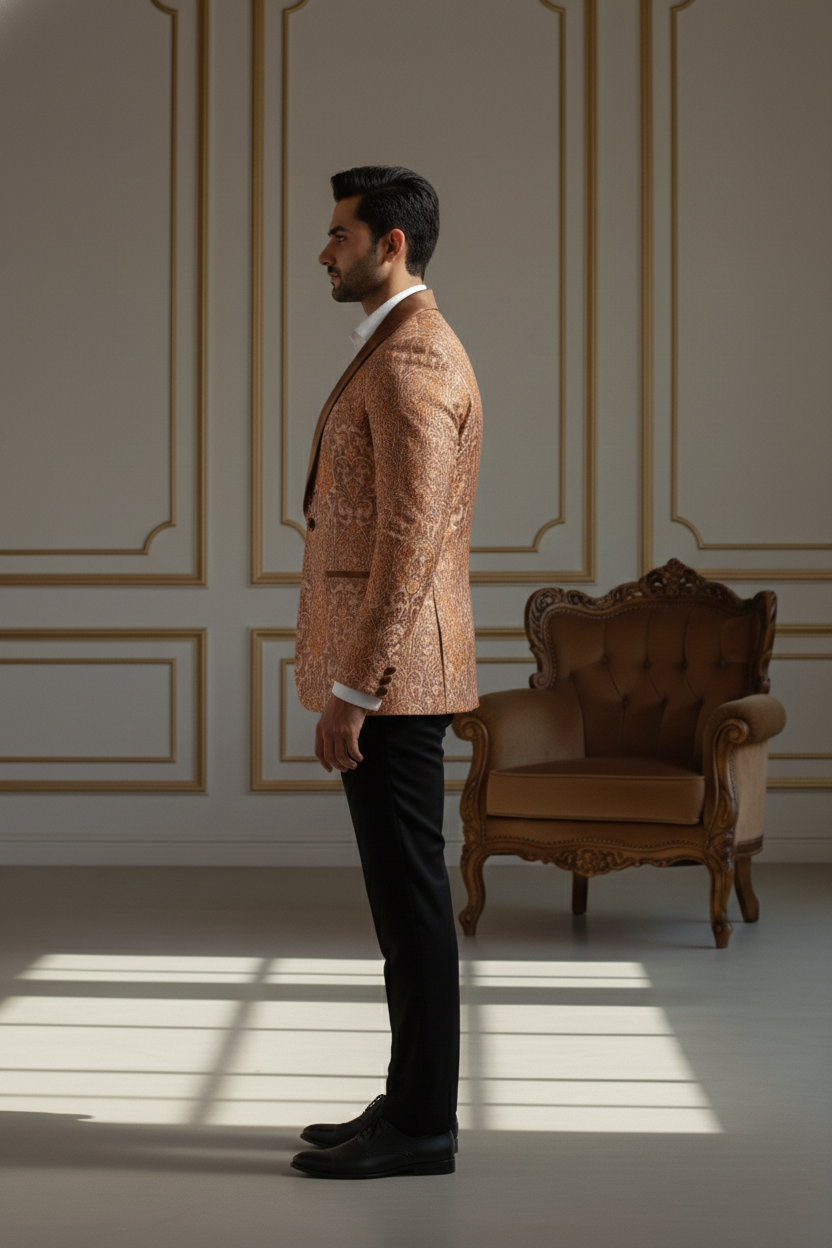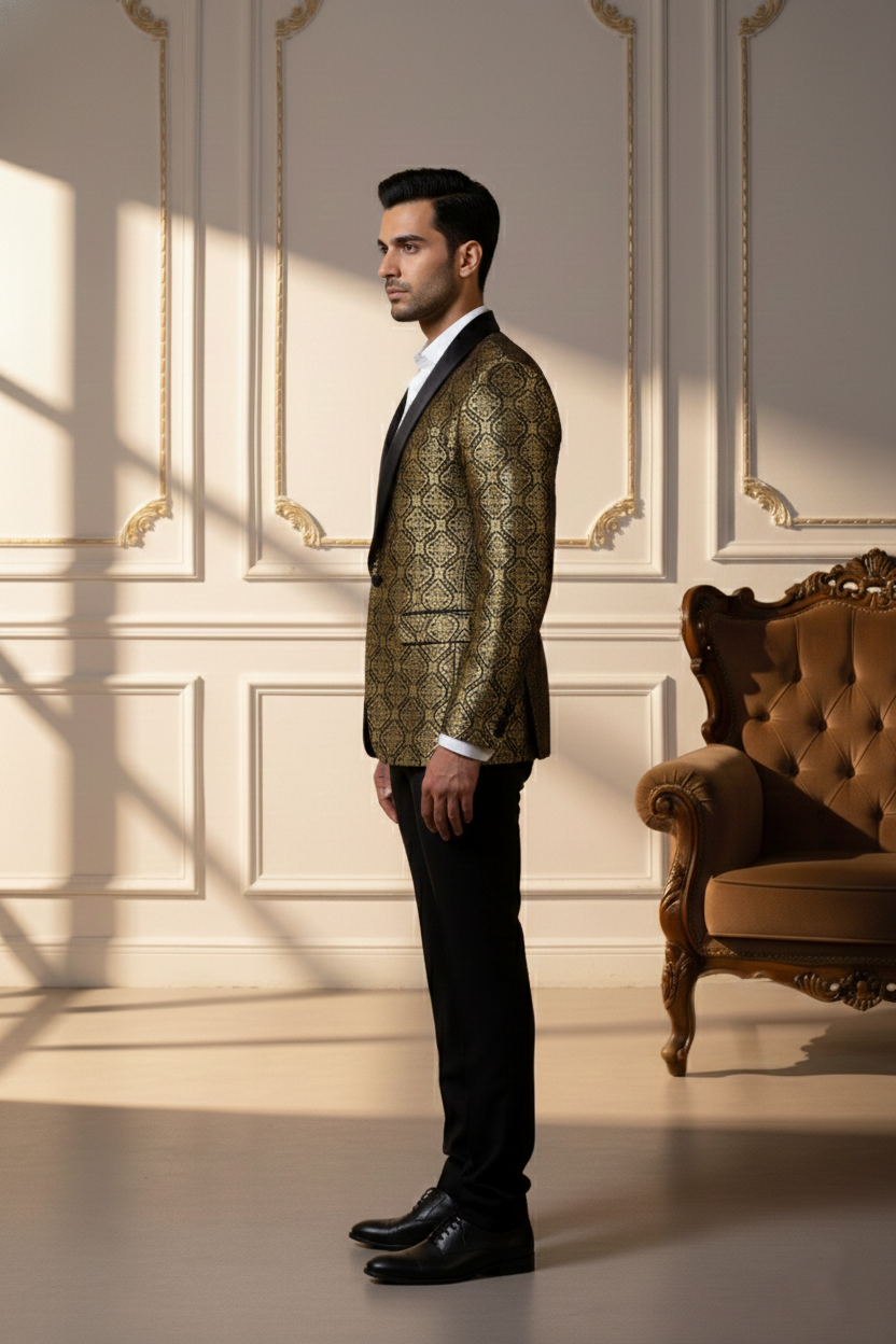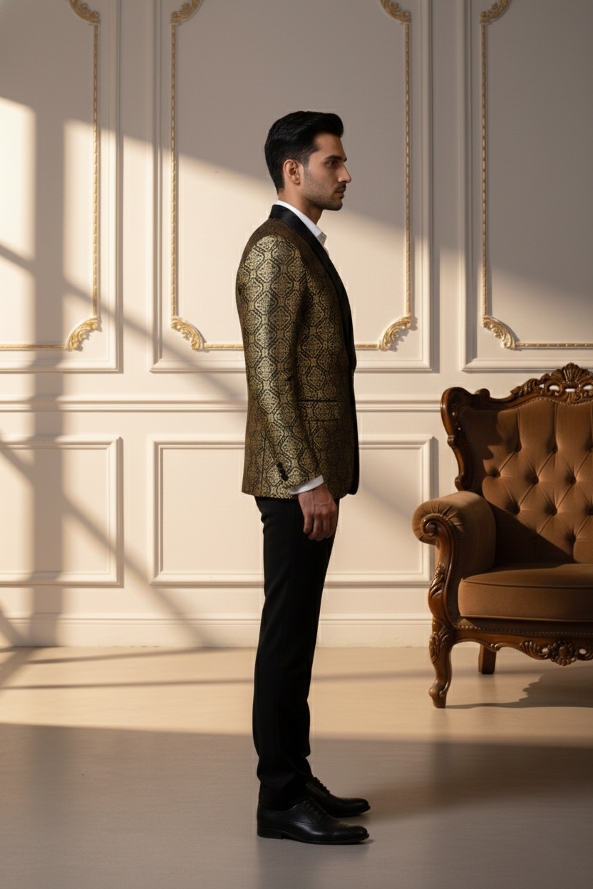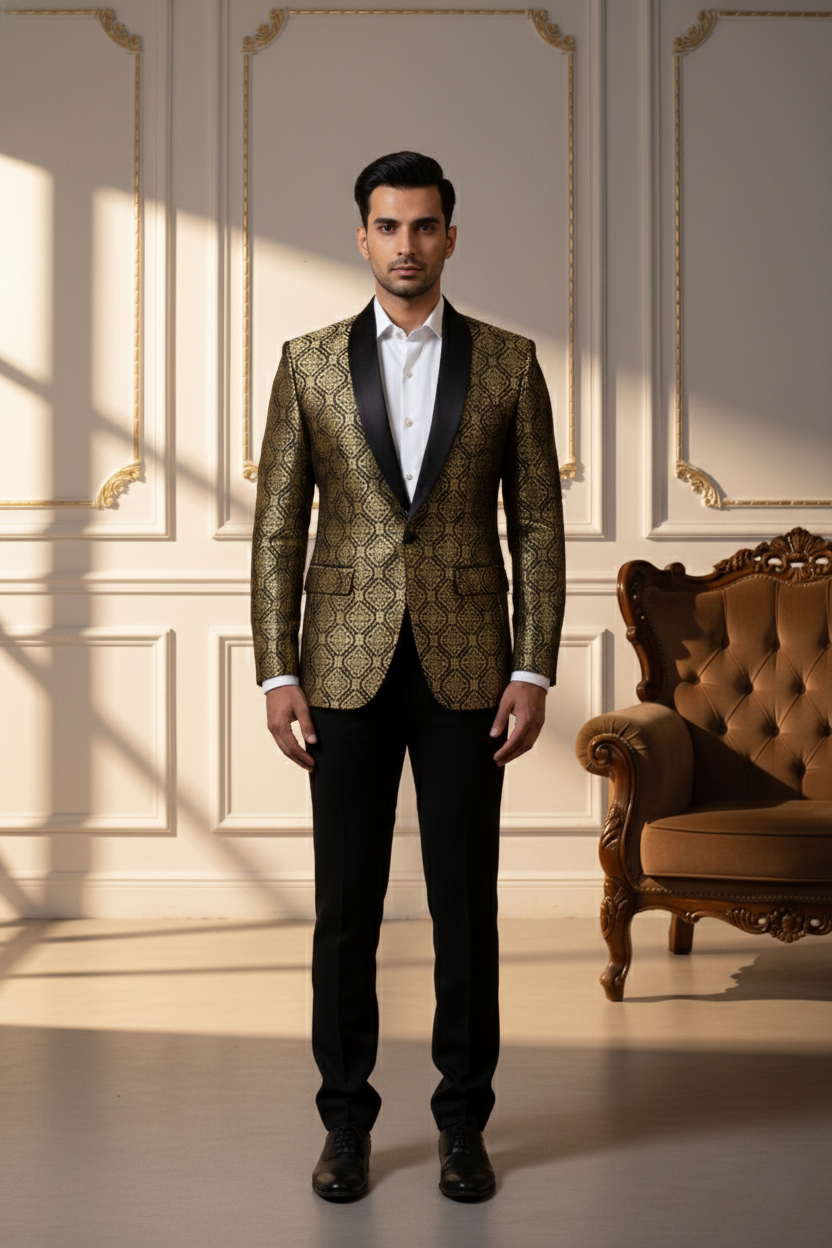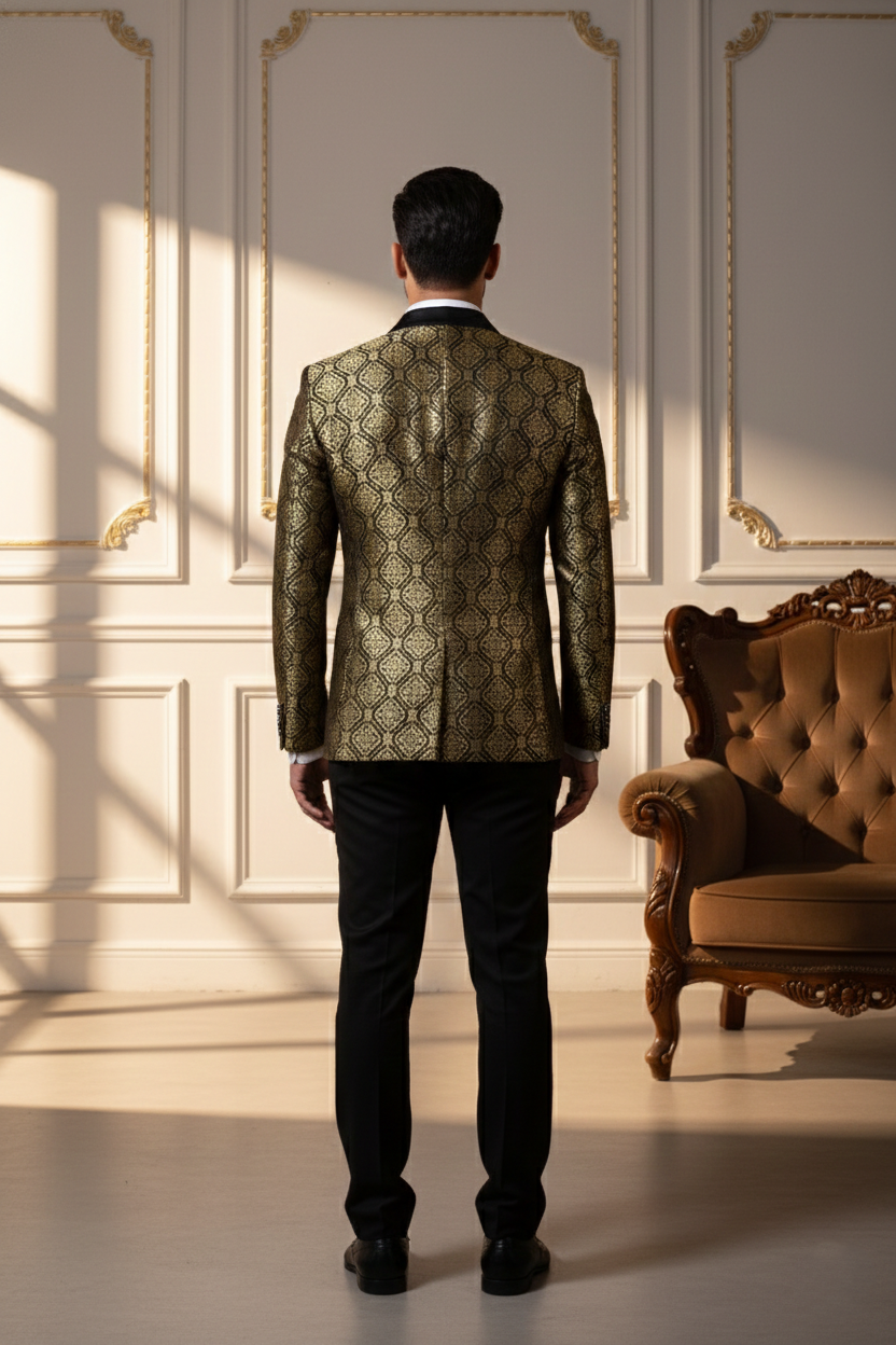 The jacket is tailored in a slim-fit silhouette to ensure a sharp look without compromising on comfort. It features a classic five-button placket with premium dark buttons that complement the overall aesthetic. Whether you are attending a grand wedding at a palace, a high-profile corporate gala, or a festive family gathering, this Nehru jacket serves as the ultimate layering piece.