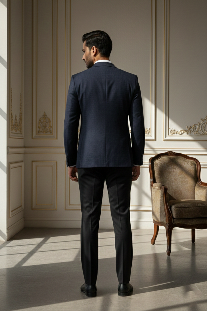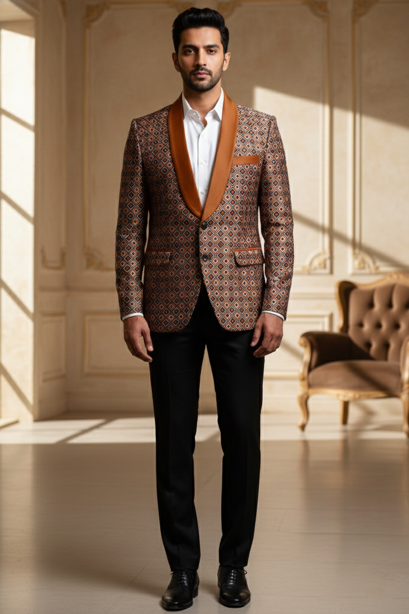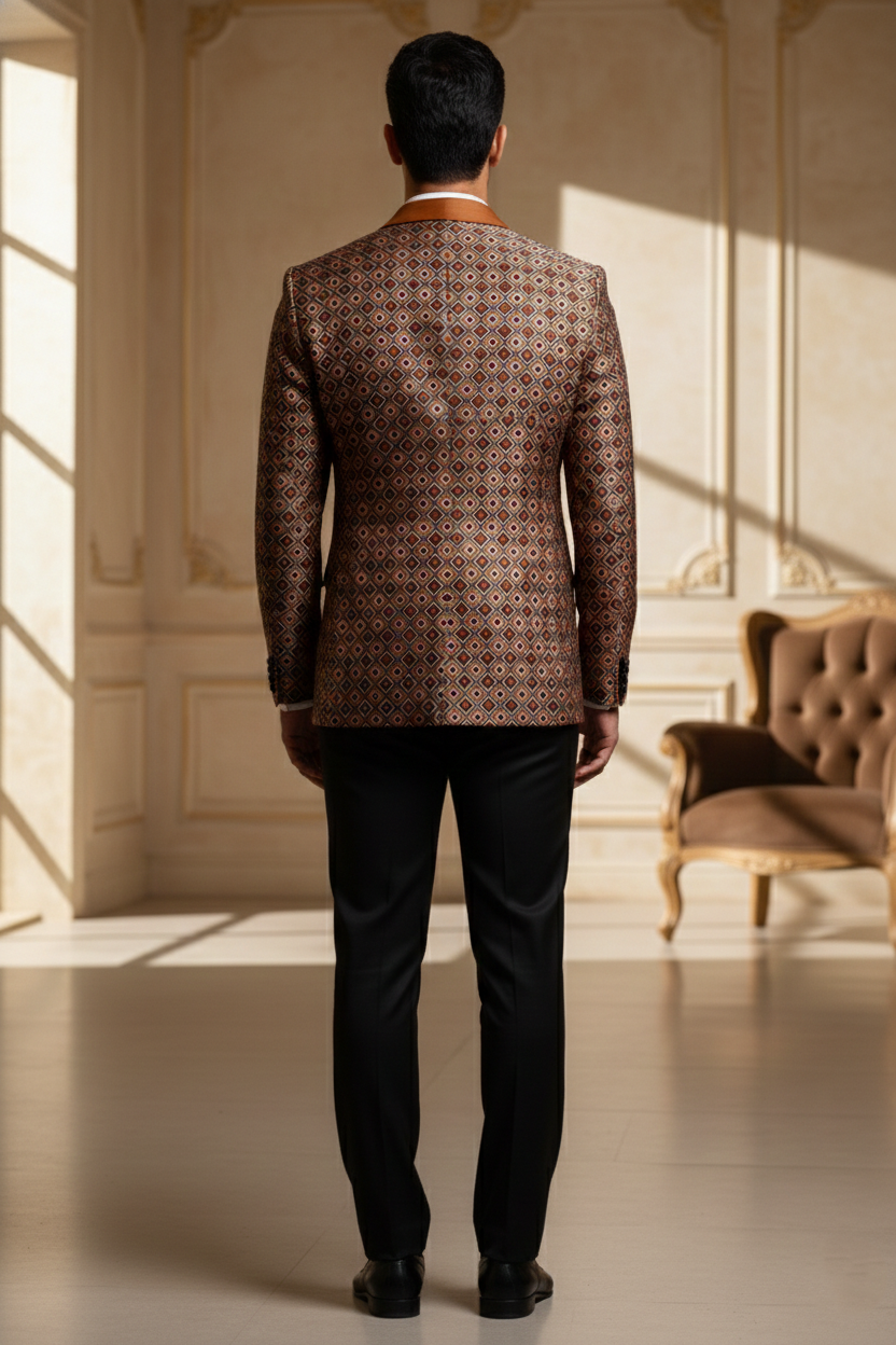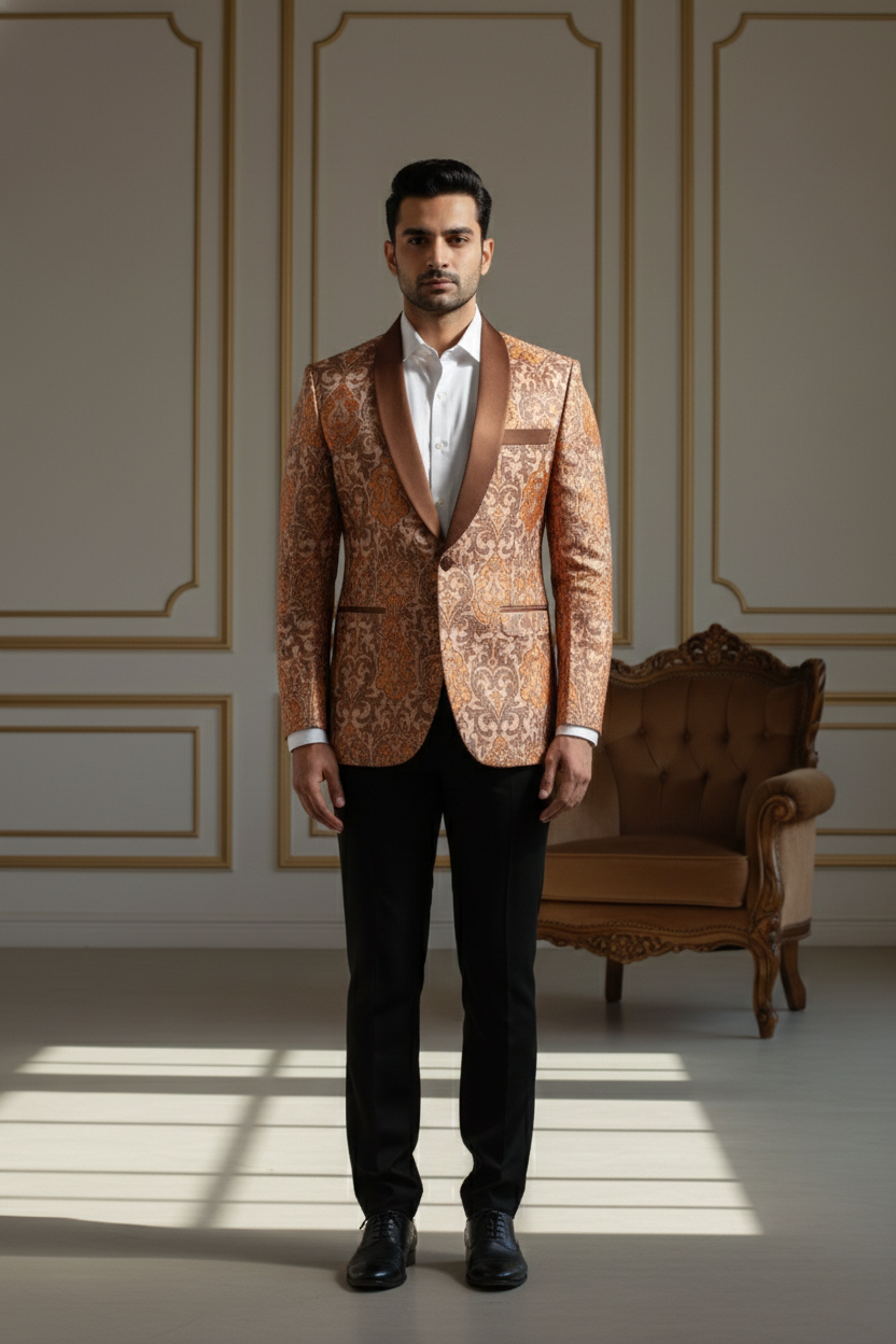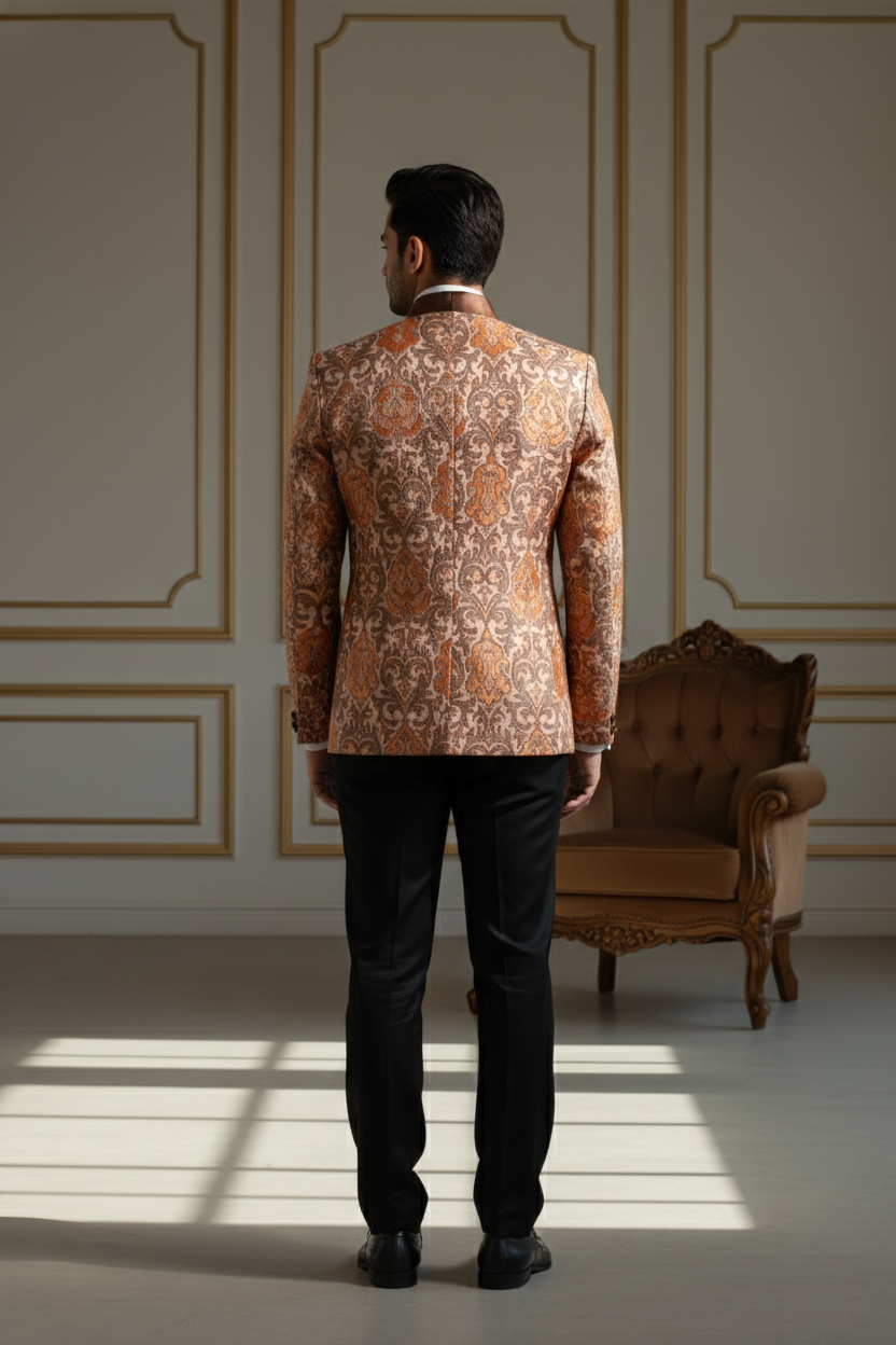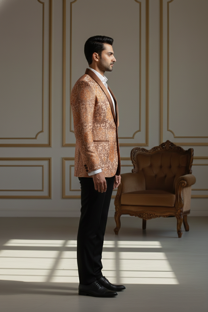 The jacket is tailored in a slim-fit silhouette to ensure a sharp look without compromising on comfort. It features a classic five-button placket with premium dark buttons that complement the overall aesthetic. Whether you are attending a grand wedding at a palace, a high-profile corporate gala, or a festive family gathering, this Nehru jacket serves as the ultimate layering piece.