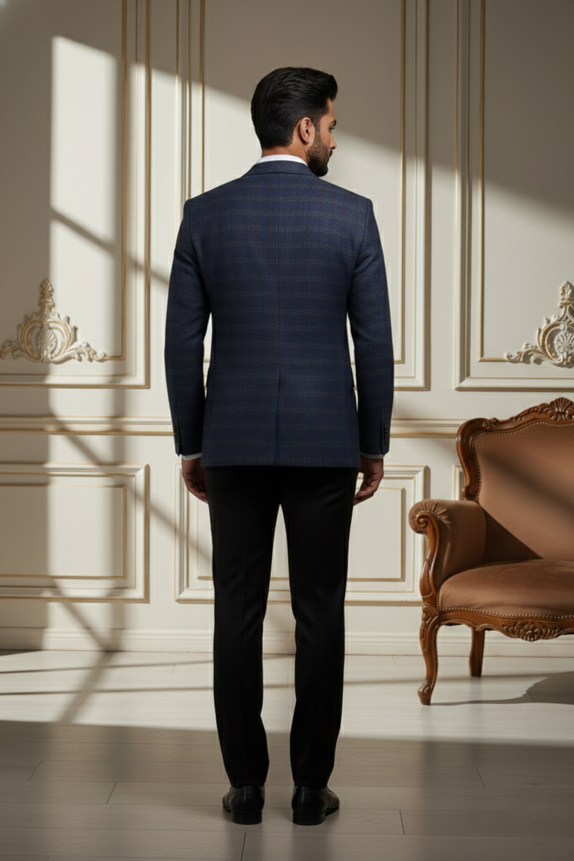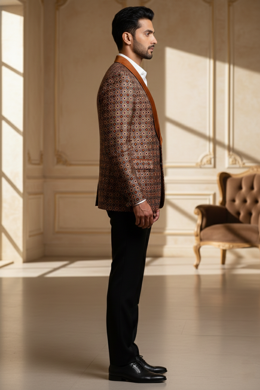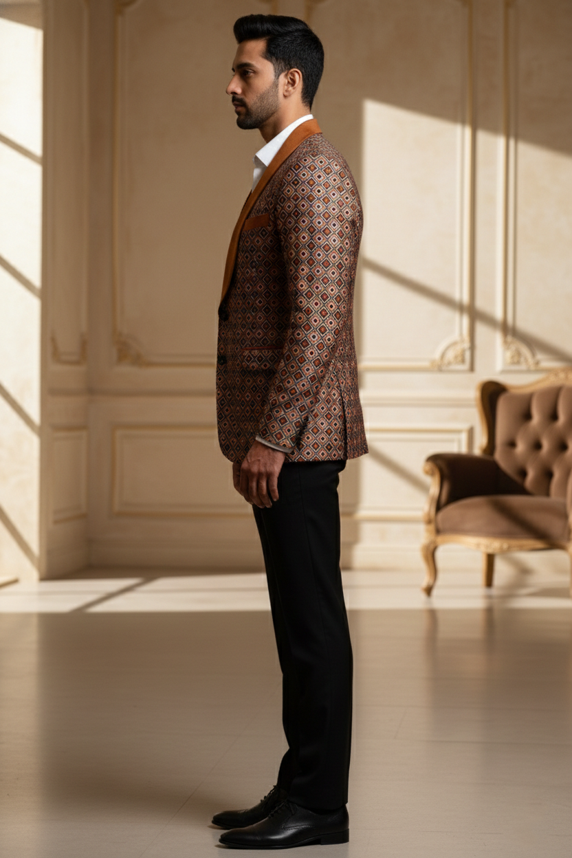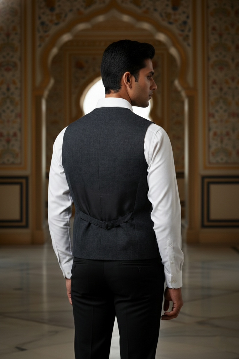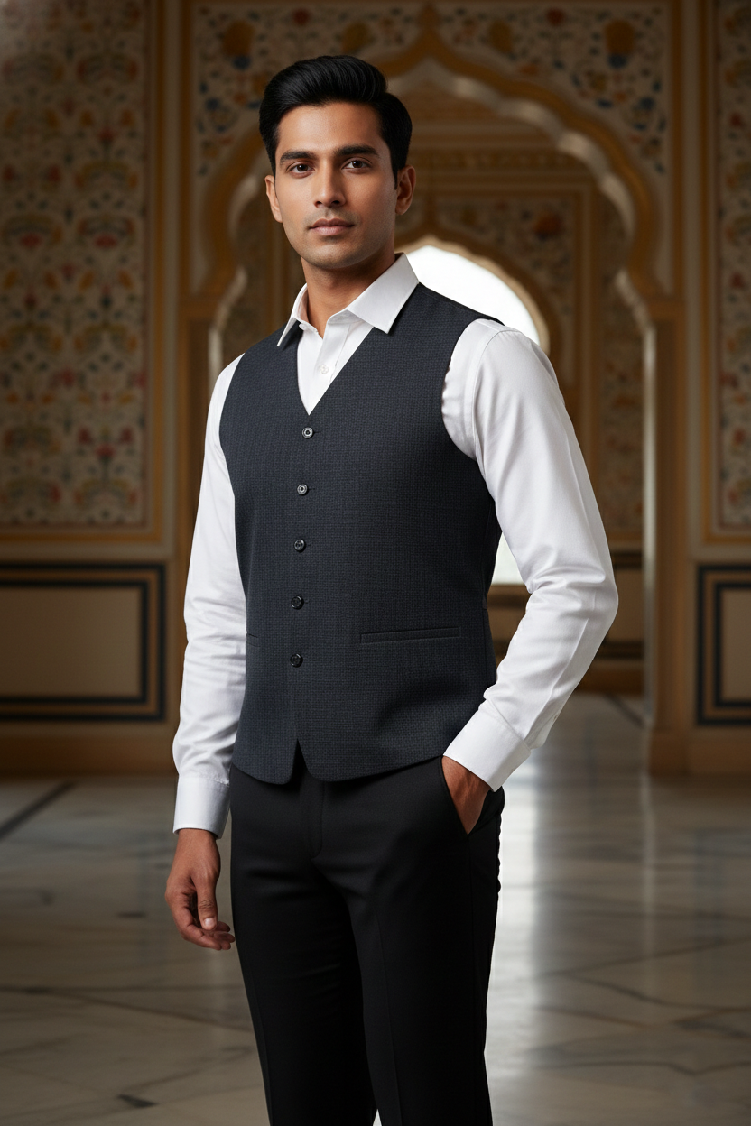 As shown, it pairs impeccably with a crisp off-white or cream linen kurta pajama set, allowing the textured fabric of the jacket to take center stage. The sleeveless design offers freedom of movement, while the structured build provides a regal posture. Elevate your style quotient by adding a pocket square or pairing it with handcrafted mojaris for a complete Indian ethnic ensemble.