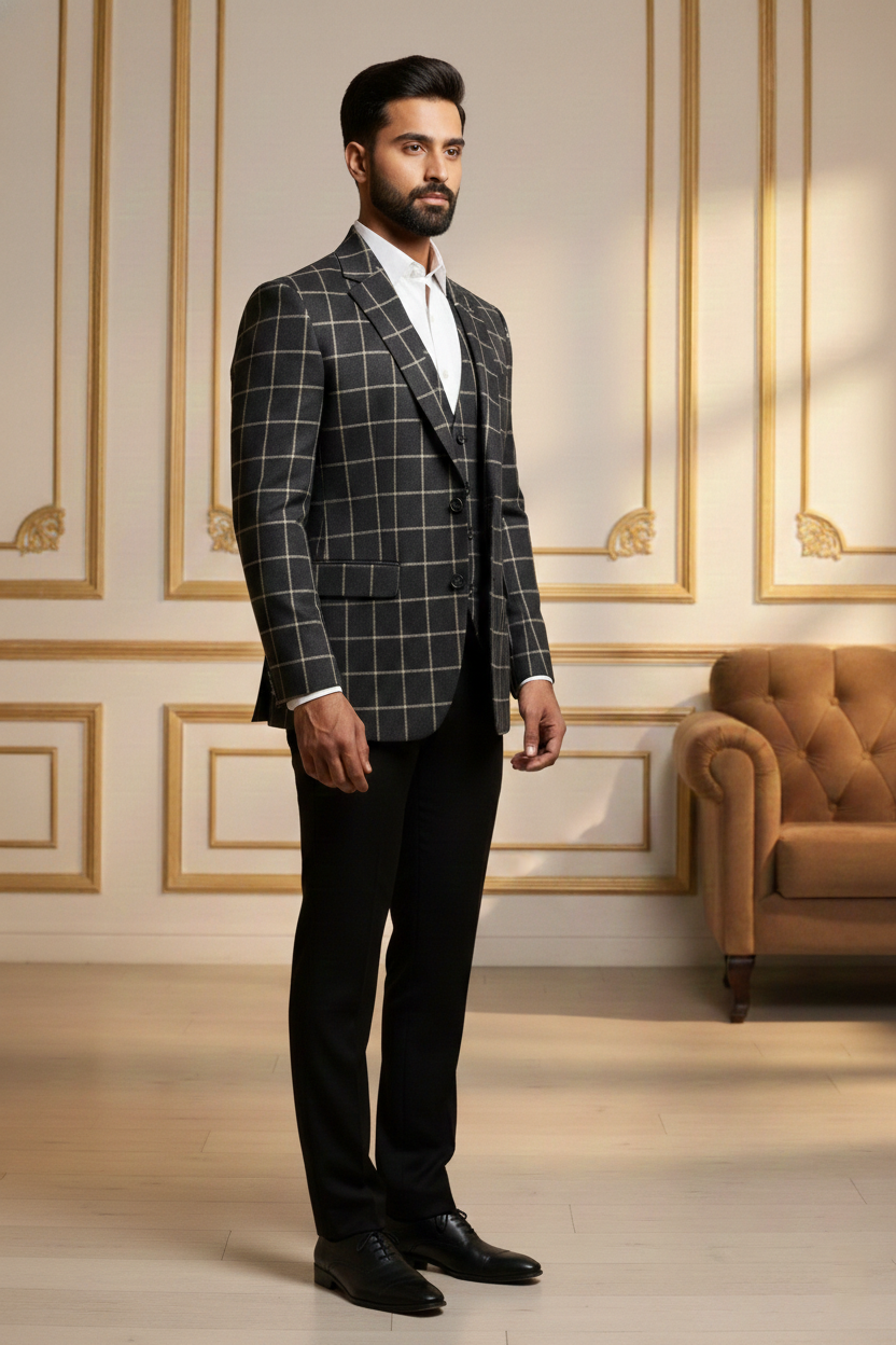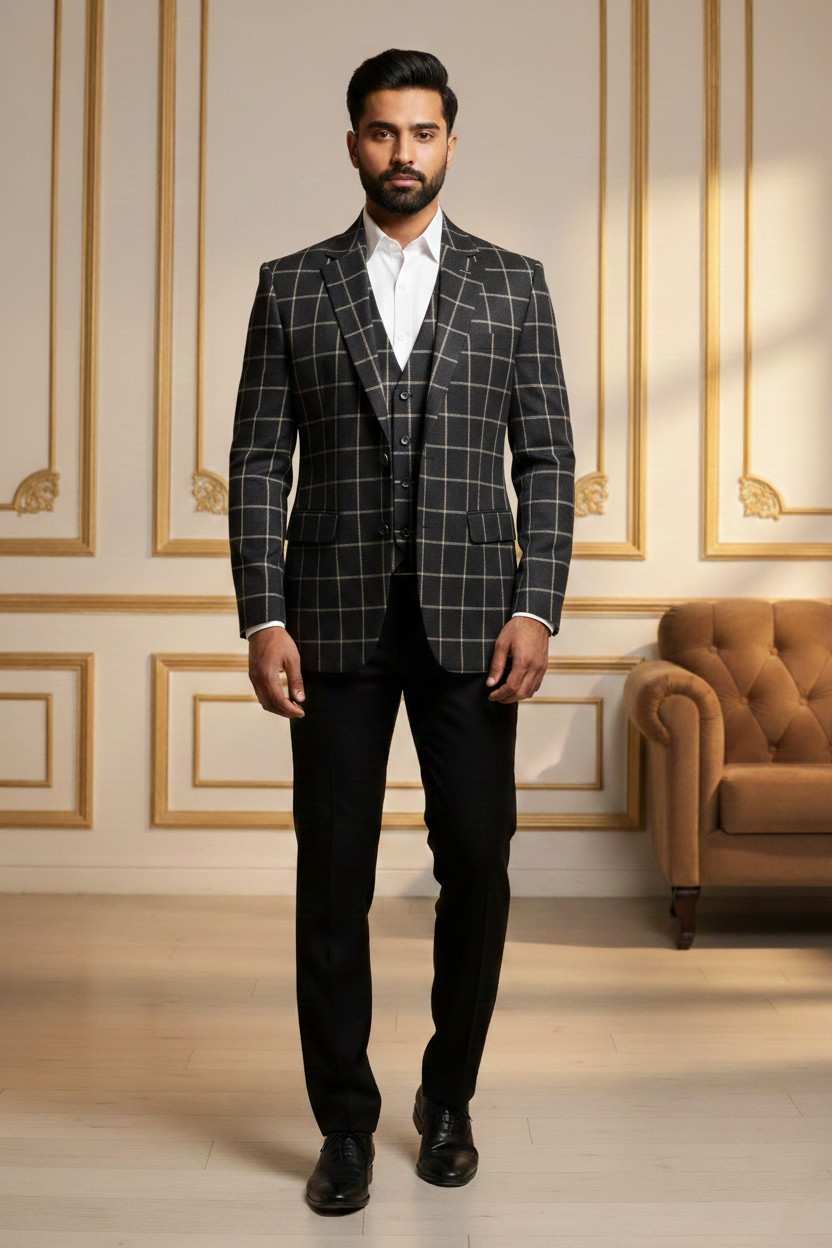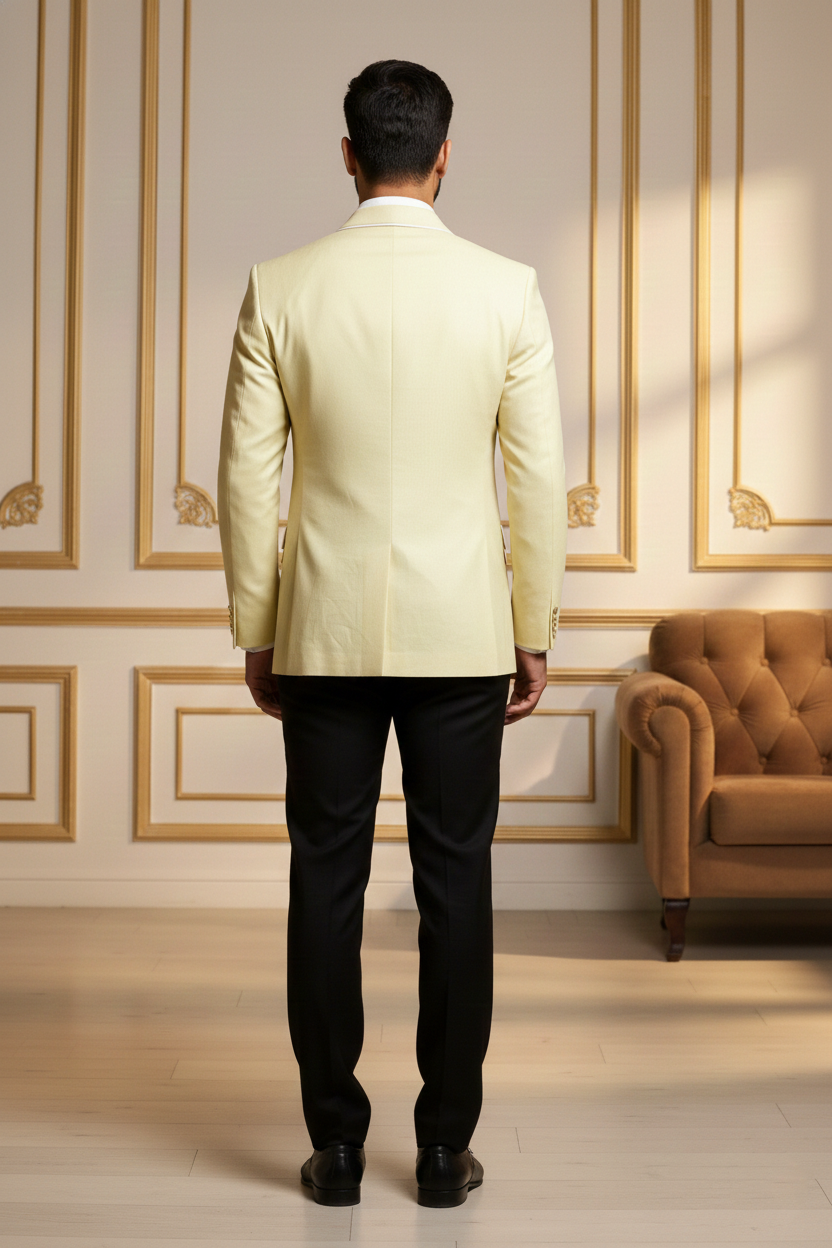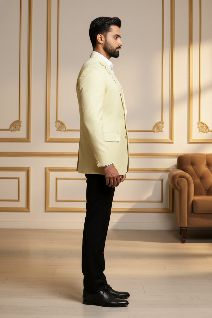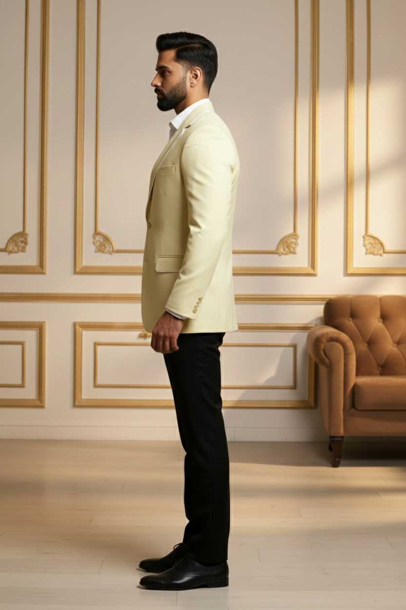 Redefine contemporary ethnic elegance with this Premium Beige Nehru Jacket, a masterpiece designed for the modern man who values tradition with a sharp, sophisticated edge. Crafted from high-quality khadi-textured fabric, this waistcoat features a distinct visual depth that exudes luxury and refinement. The earthy beige tone is perfectly balanced by striking contrast black accents on the mandarin collar and the welt pockets, making it a versatile addition to your festive and formal wardrobe.