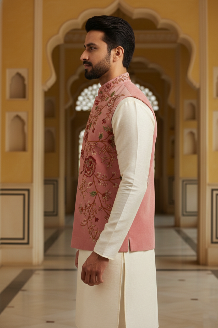 As shown, it pairs impeccably with a crisp off-white or cream linen kurta pajama set, allowing the textured fabric of the jacket to take center stage. The sleeveless design offers freedom of movement, while the structured build provides a regal posture. Elevate your style quotient by adding a pocket square or pairing it with handcrafted mojaris for a complete Indian ethnic ensemble.